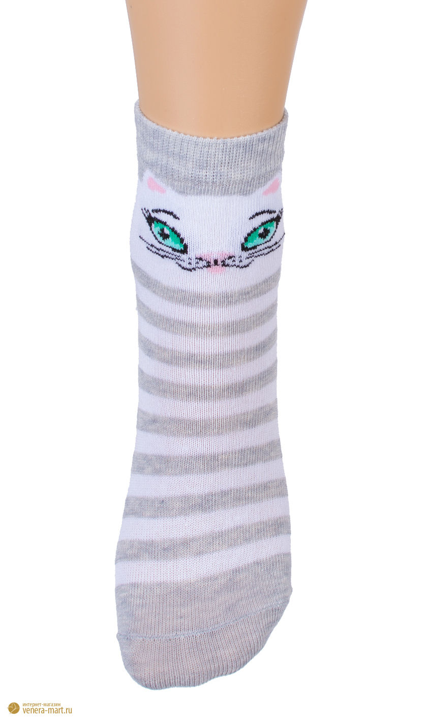 Носки машинной вязки со средним паголенком, рисунком в полоску и кошачьей мордочкой на паголенке спереди. Яркая модель для повседневной носки.